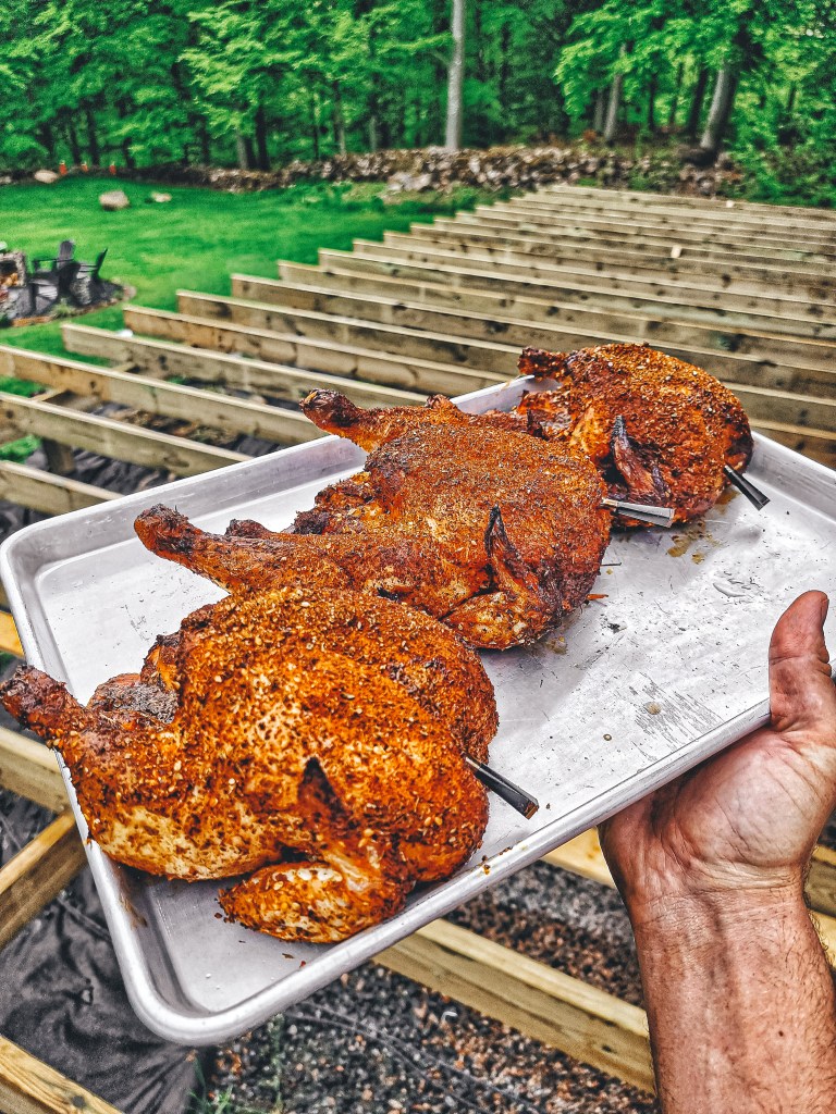 Helgrillad kyckling som är sådär underbart saftig. Avtagen på 68 grader i filéerna och fick lite röksmak från äppelchunks. Rubbad med Grillkrydda Amerikansk från favoriterna på Borgeby Kryddgård.