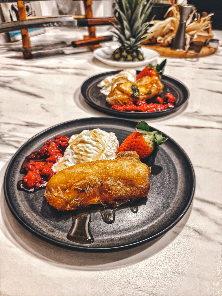 Denna efterrätt är friterad banan i rispapper med ananas, vaniljglass, lönnsirap, jordgubbar och lite hallon.