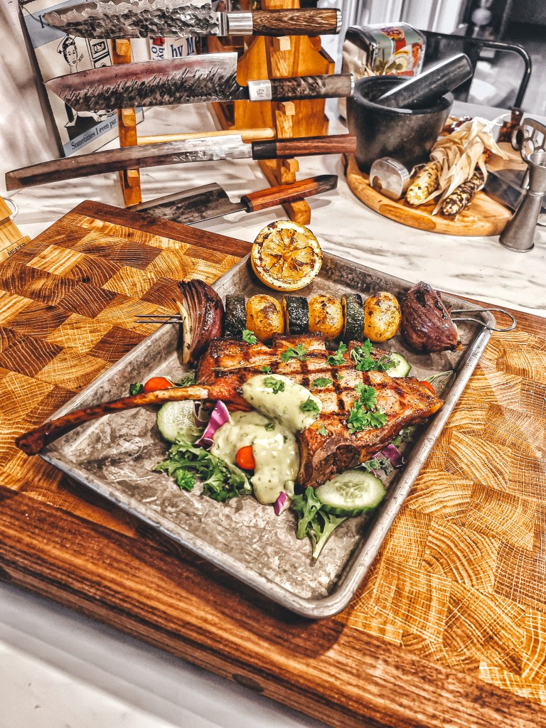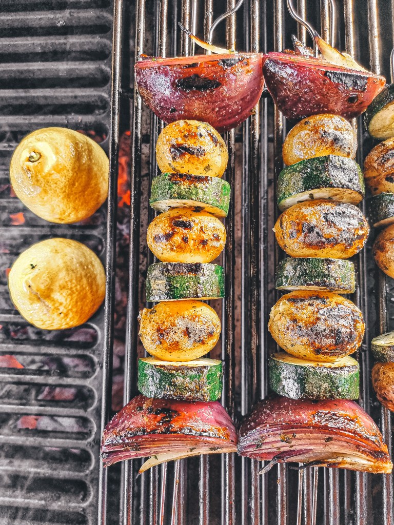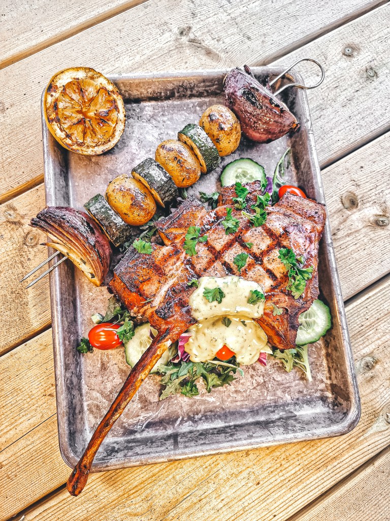 Grillade kotlettracks serverat med potatis, zucchini och rödlök på spett. Lite sallad, grillad citron, tomat och gurka tillsammans med en dijonsenapsvinägrett med dragon och persilja.