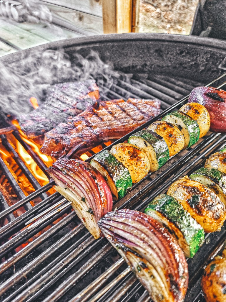 Träddes på spett tillsammans med zucchini och rödlök som i sin tur penslades med smält smör och olivolja smaksatt med Boars Night Out White Ligtning Garlic Rub och började med het eld för att sedan gå klart indirekt.
