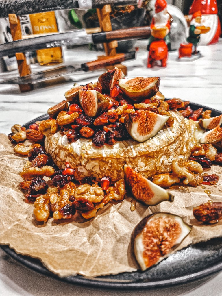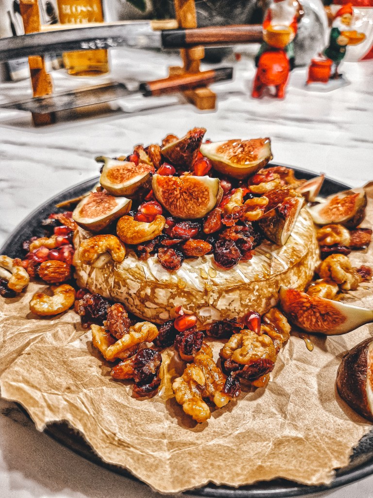 Lägg brieosten på ett fat, häll över blandningen med nötter och tranbär. Dekorera med färsk granatäpple och färska fikon.