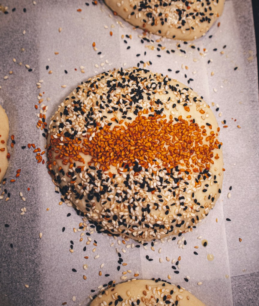 * Vispa ihop ägget med vattnet och pensla bröden. Strö över sesamfrön eller annan topping. (valfritt)